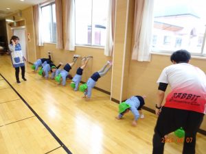 さくら保育園では2歳児クラス以上を対象に、週に1回「体操教室」を実施し、体操の先生(いわきラビット体操クラブ)に指導してもらっています。