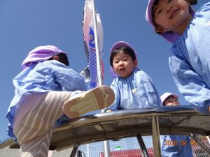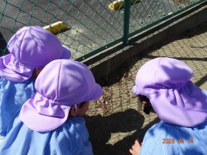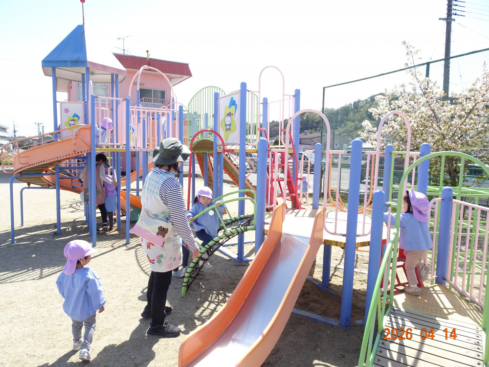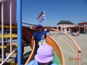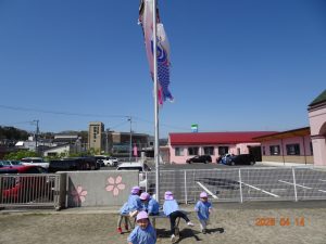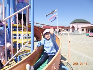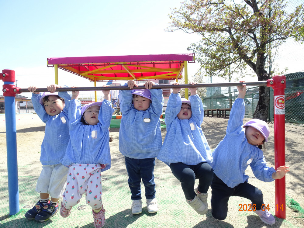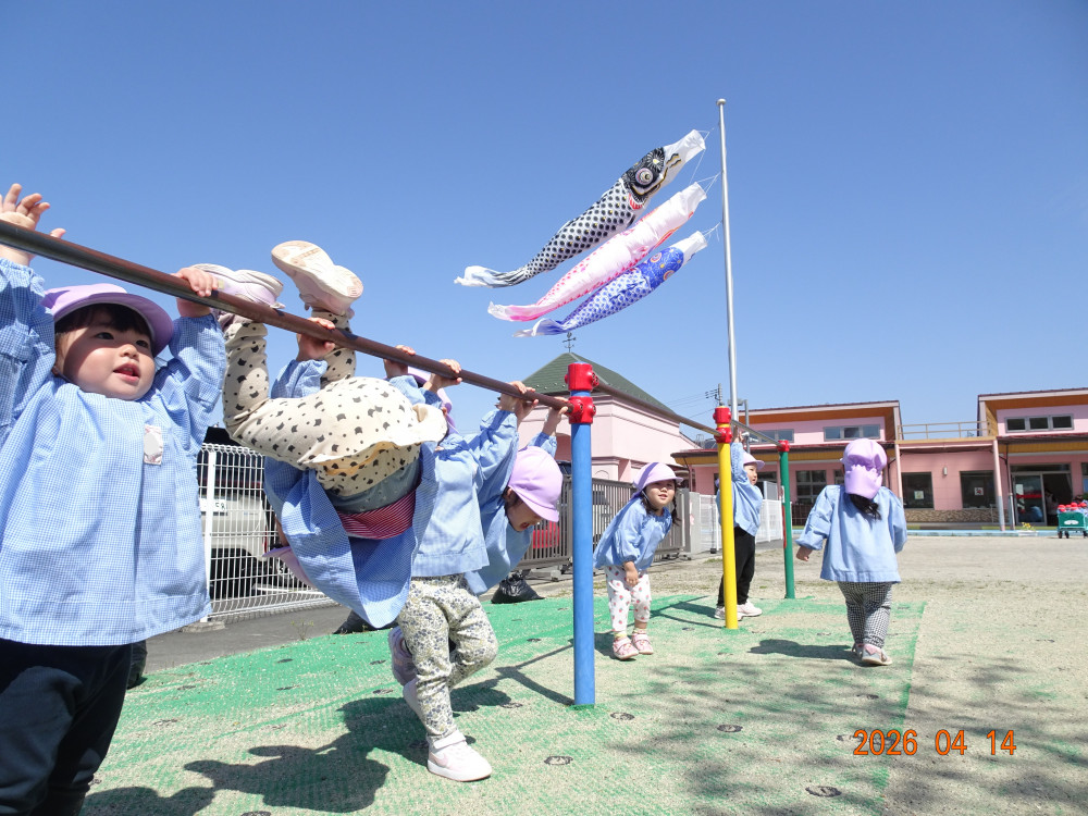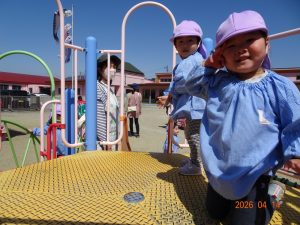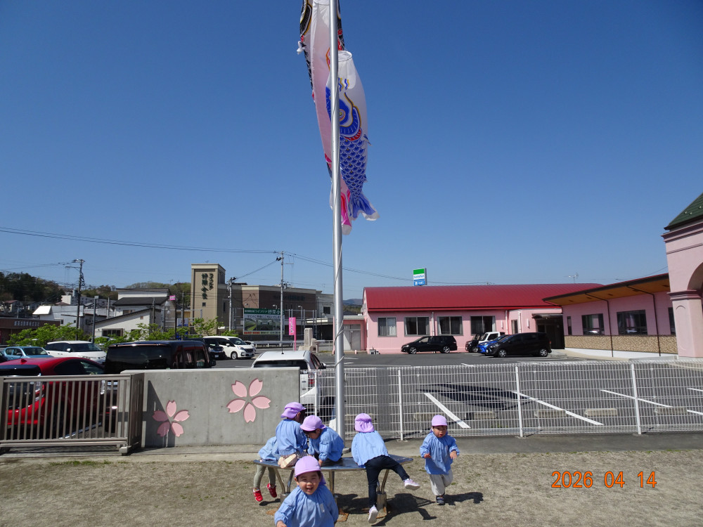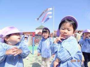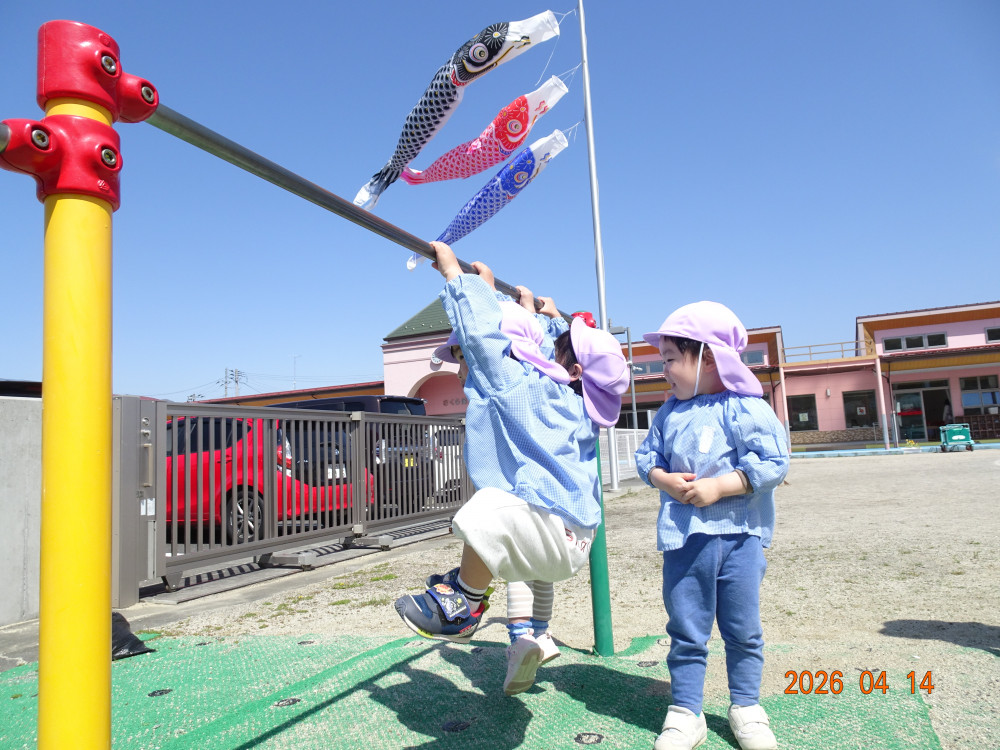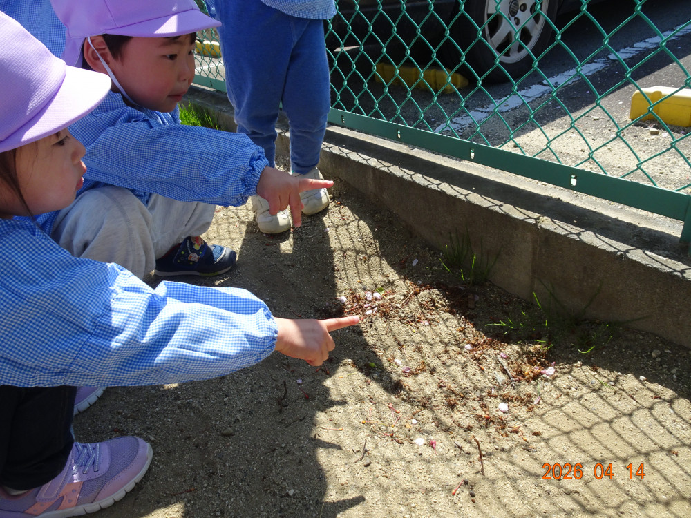 さくら保育園のこいのぼりが春風に乗って元気に泳いだ本日、令和8年4月14日(火)、2歳児クラスすみれ組も園庭で元気に遊びました。 2歳児クラスに進級して間もないですが、一段と行動力や表現力(言葉)が増してきています。 虫探しも夢中。 「なにをみつけたのかな?」