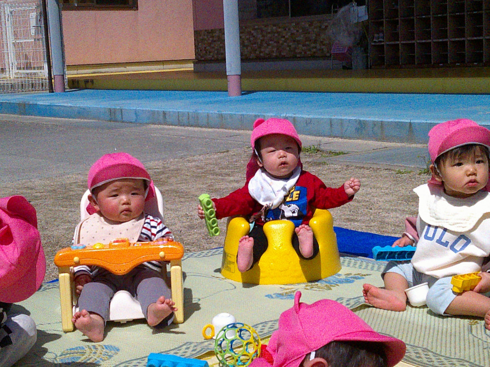 ポカポカ陽気の本日、令和8年4月17日(金)、0歳児クラスこうめ組は園庭に出て外気浴「ひなたぼっこ」をしました。