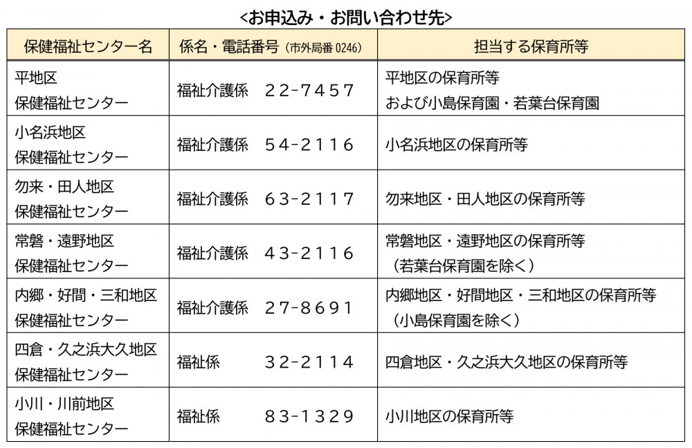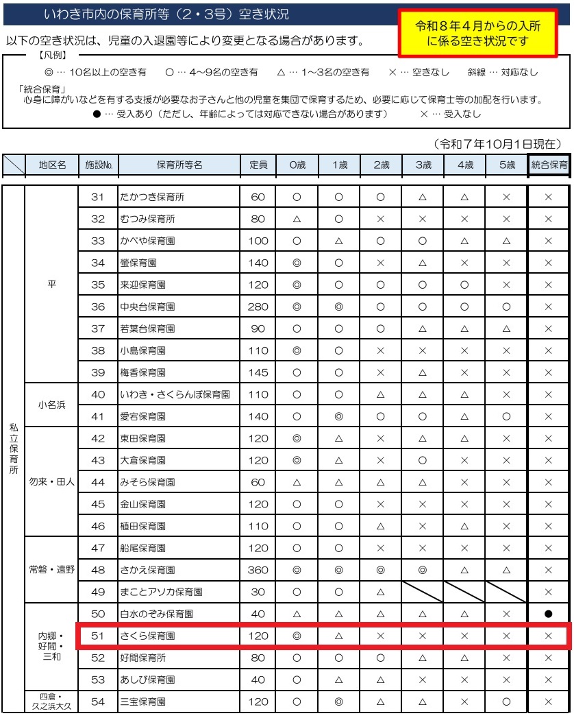 さくら保育園に入園ご希望の方は、令和7年10月7日(火)に内郷・好間・三和地区保健福祉センター(いわき市内郷高坂町四方木田191 いわき市総合保健福祉センター2階 ☎0246-27-8691)でいわき市の職員が受け付けします。受付時間は13時30分から16時まで。