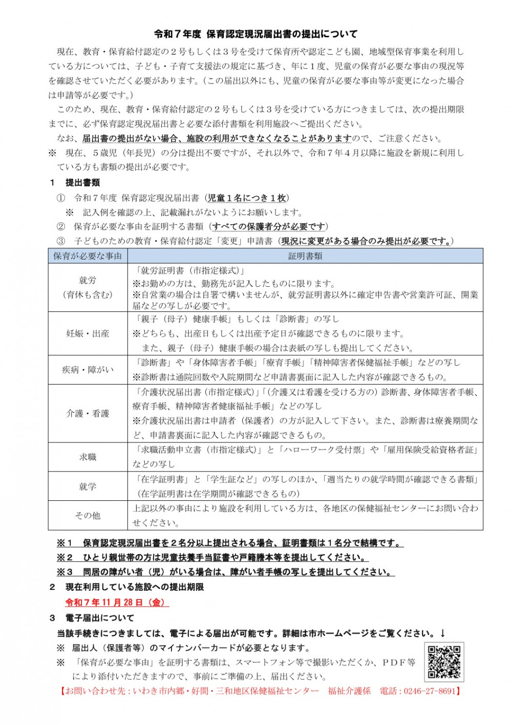 いわき市より、在園児(年長児を除く)の保護者を対象に「現況届出書」の提出依頼がありました。