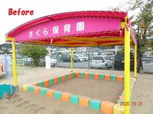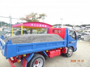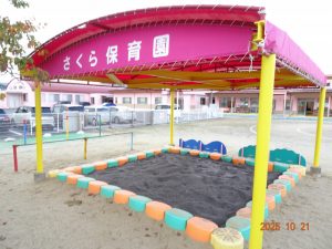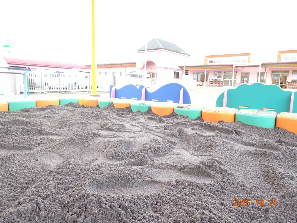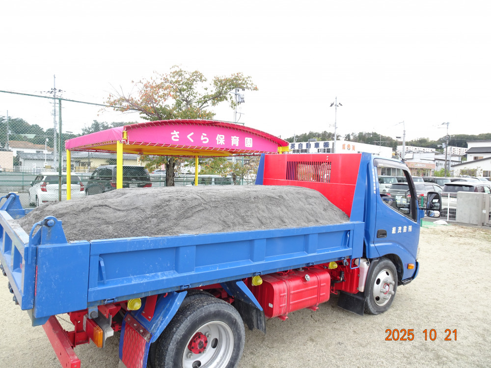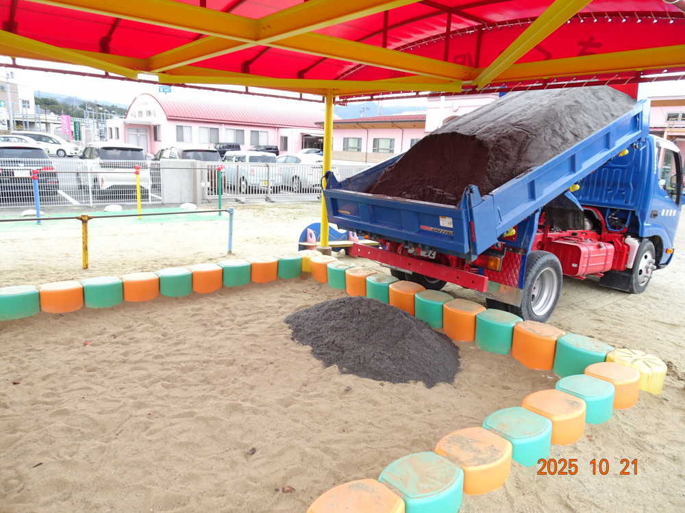 さくら保育園園庭の砂場の砂がだいぶ少なくなってきたので、本日、令和7年10月21日(火)に砂を補充しました。2トン。