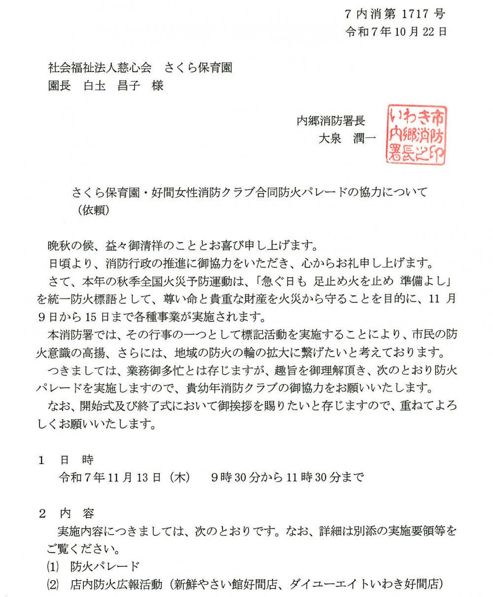 この度、さくら保育園があるいわき市好間町を管轄している「いわき市内郷消防署」より、その運動の一環として令和7年11月13日(木)にさくら保育園の子どもたち(さくら保育園幼年消防クラブ)に防火パレードおよび広報活動をしてほしいとのご依頼をいただき、喜んでお引き受けしました。