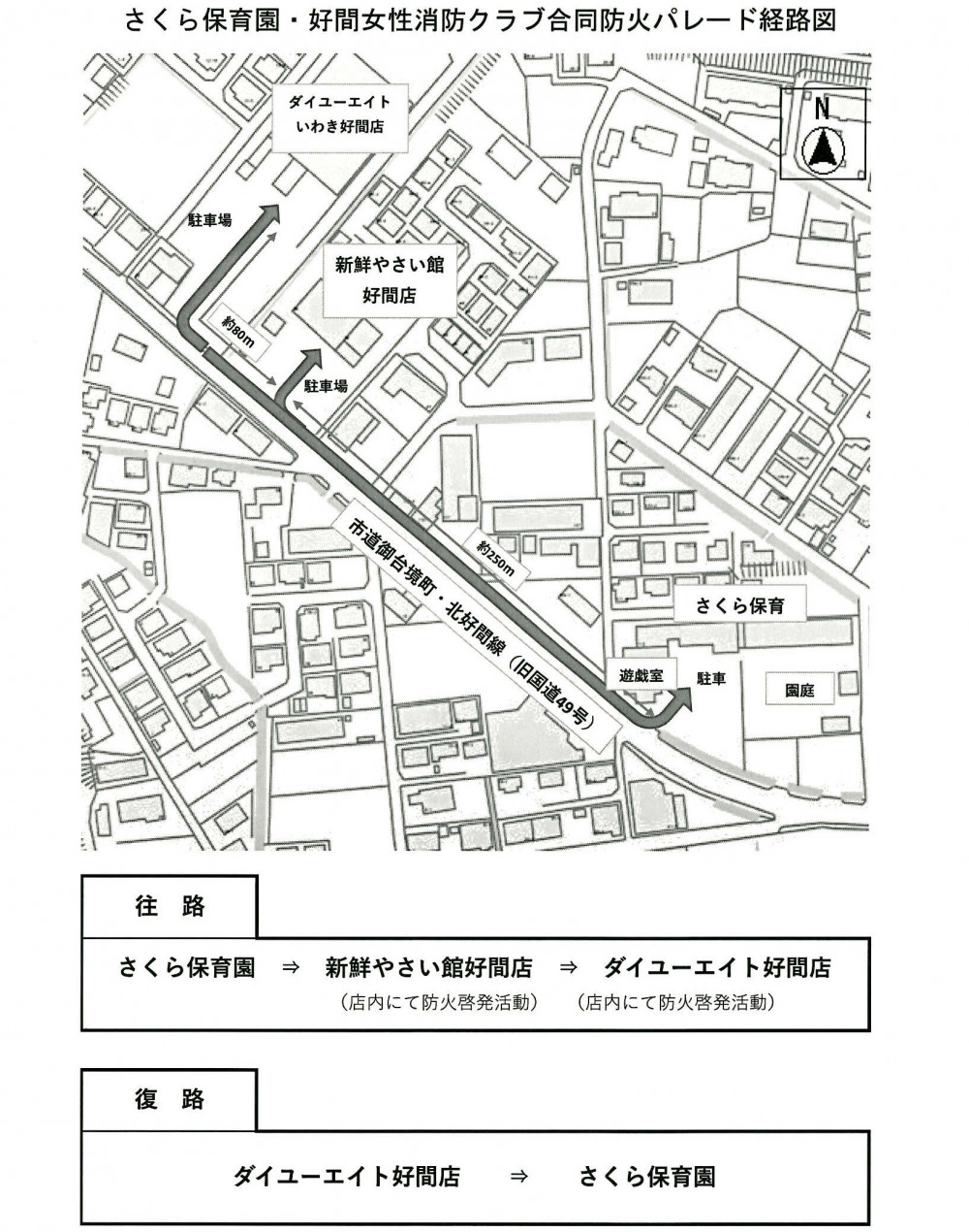 さくら保育園を出発して、JA新鮮やさい館好間店を経由し、ダイユーエイトいわき好間店まで防火パレードをする計画です。