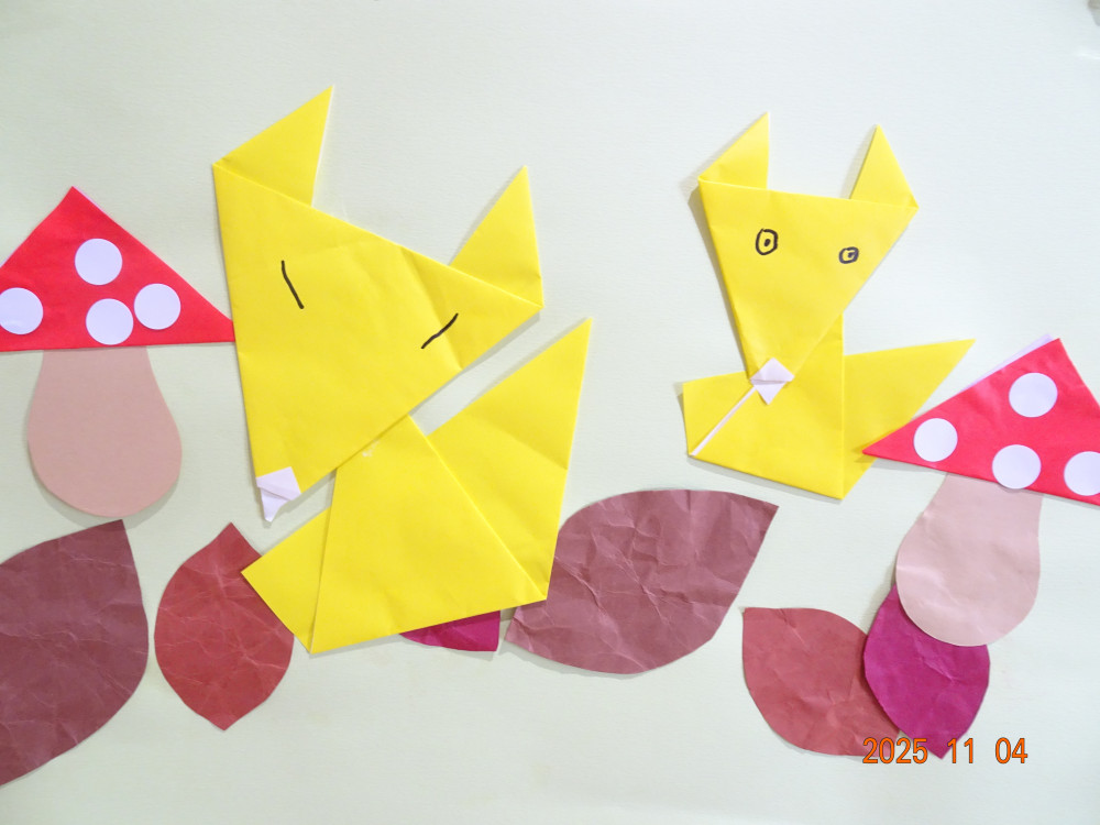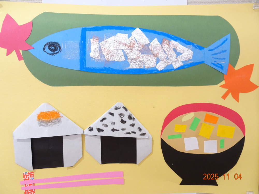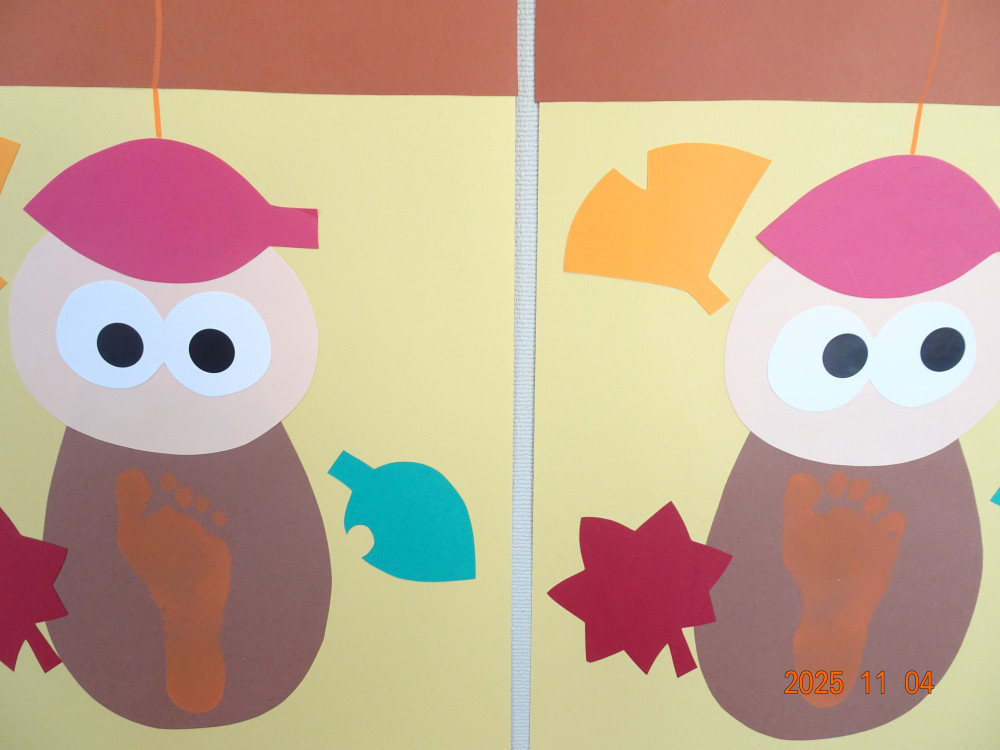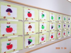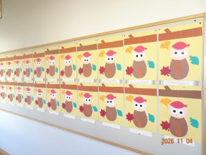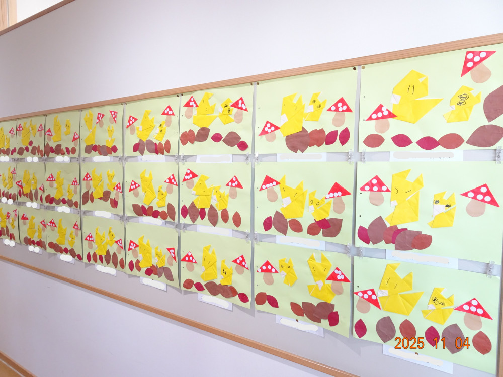 今月、令和7年11月の壁面製作(さくら保育園の内廊下の掲示板月間展示)は、紅葉の秋・芸術の秋・実りの秋・食欲の秋など、秋にまつわる作品です。 1歳児クラスうめ組の作品 2歳児クラスすみれ組の作品 3歳児クラスきく組の作品 4歳児クラスゆり組の作品 5歳児クラスひまわり組の作品