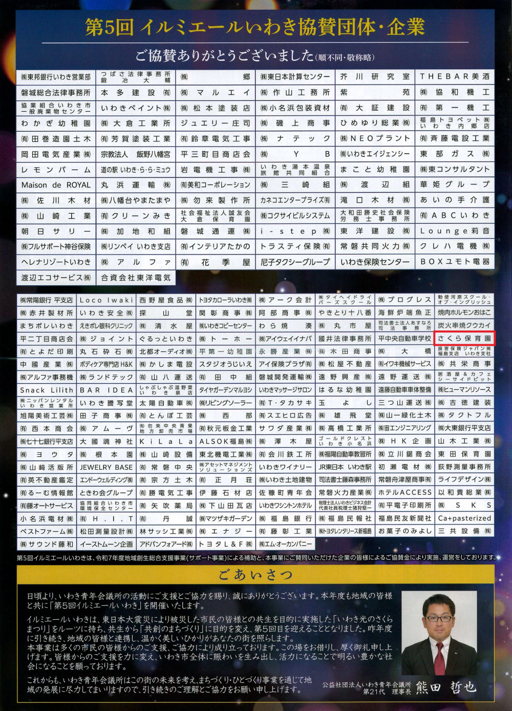 令和7年11月22日(土)から、いわき駅前大通りで『イルミエールいわき』が開催されます。 いわき青年会議所が主催しており、その活動にさくら保育園も協賛させていただきました。 「イルミエール」とは、イルミネーションのイルミと、エールを送るのエール、フランス語で光を意味するルミエールをかけあわせて名付けられたそうです。 8万球のゴールドとホワイトのLED電球によりケヤキ並木が彩られ、煌びやかな光が訪れる人を迎えます。 是非一度ご覧になってください。感動すると思います。
