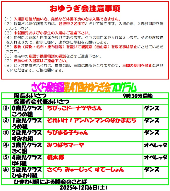 令和7年12月6日(土)開催予定の「さくら保育園第47回お遊戯会」について、先日もお知らせいたしましたが、注意事項も含め追記がありますので再掲いたします。