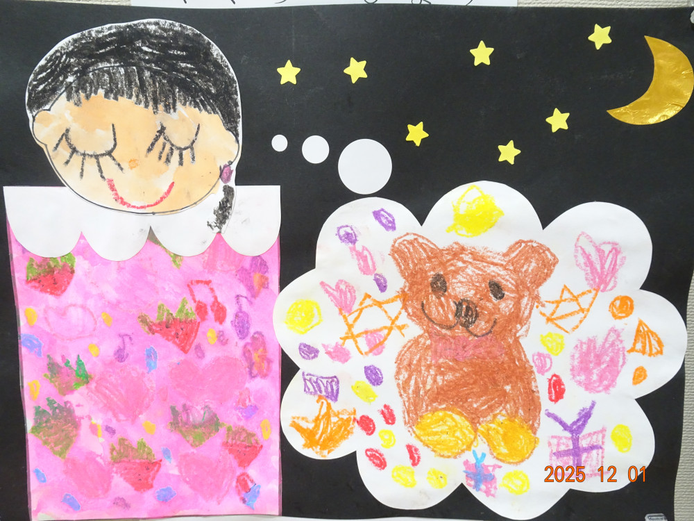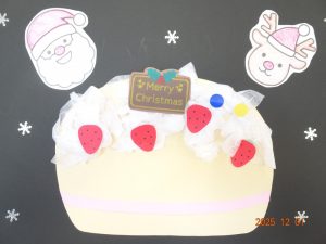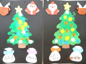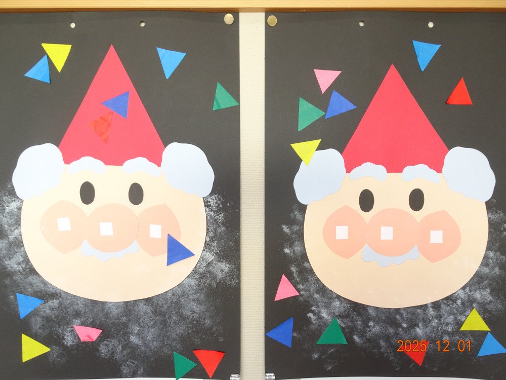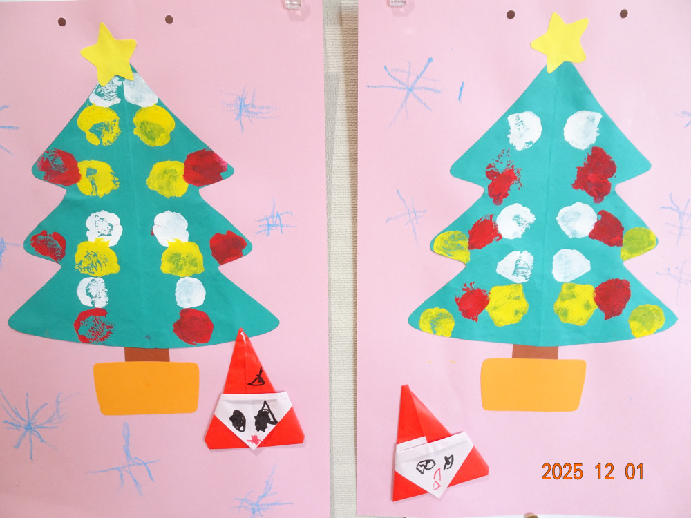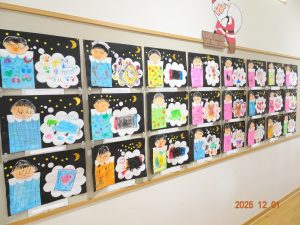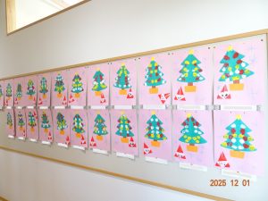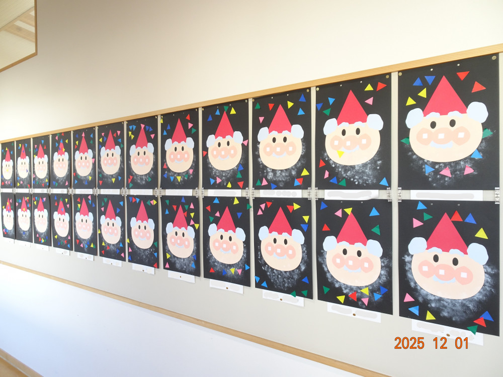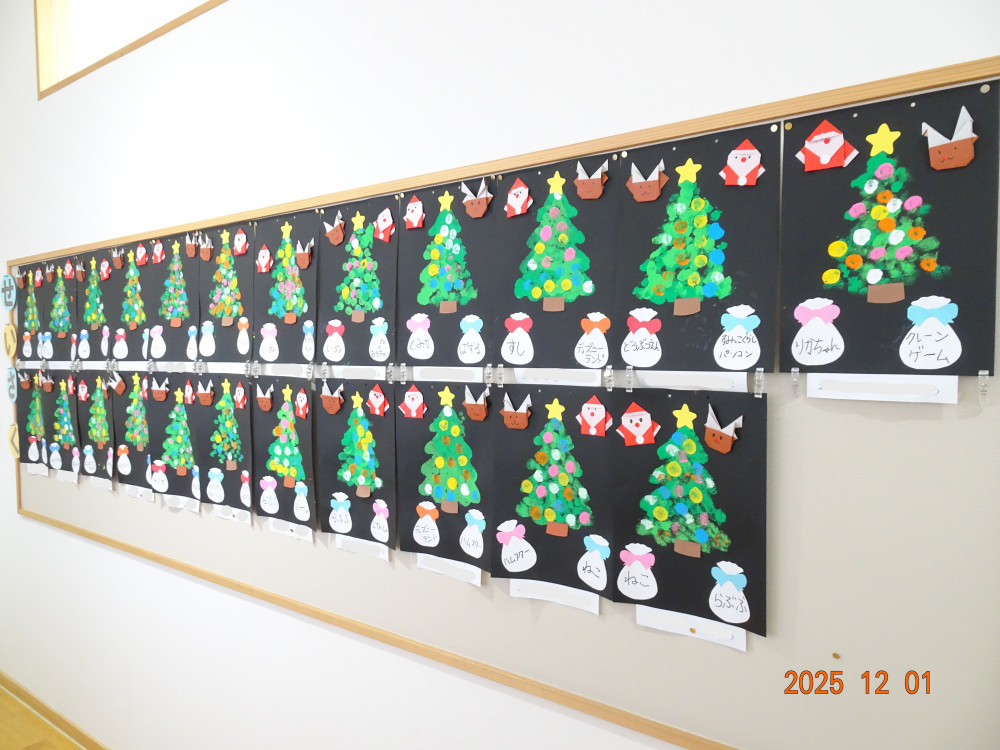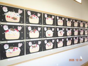 今月、令和7年12月の壁面製作(さくら保育園の内廊下の掲示板展示)は、クリスマス一色です 1歳児クラスうめ組の作品 2歳児クラスすみれ組の作品 3歳児クラスきく組の作品 4歳児クラスゆり組の作品 5歳児クラスひまわり組の作品