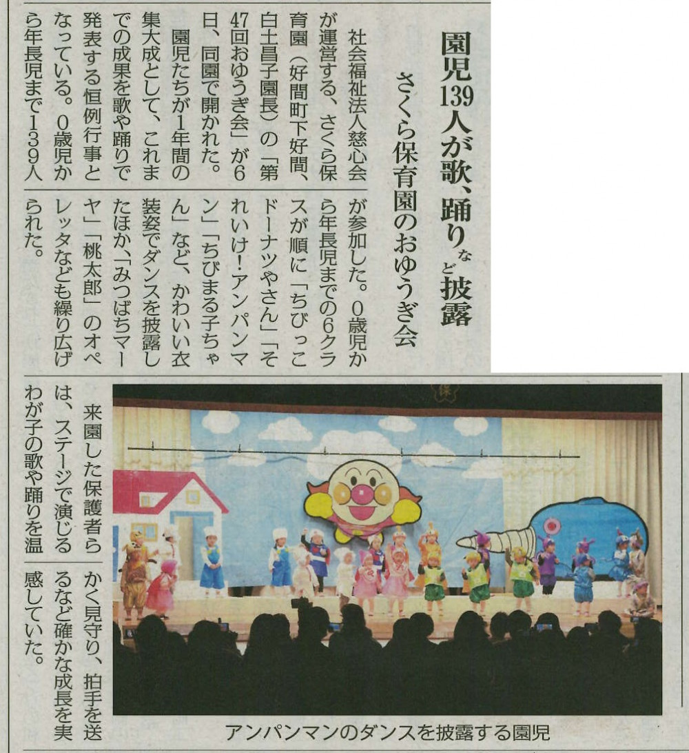 令和7年12月6日(土)に開催した「さくら保育園第47回お遊戯会」に、当日、メディア各社が取材に来てくださいました。 その記事が新聞に掲載されましたので、お知らせいたします。 いわき民報新聞2025.12.10掲載