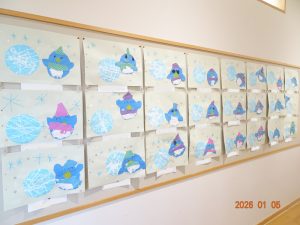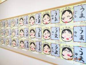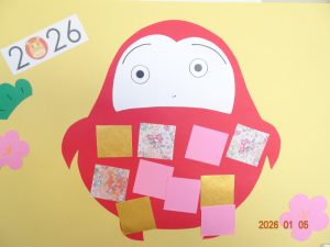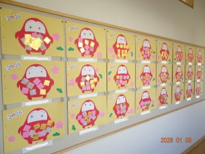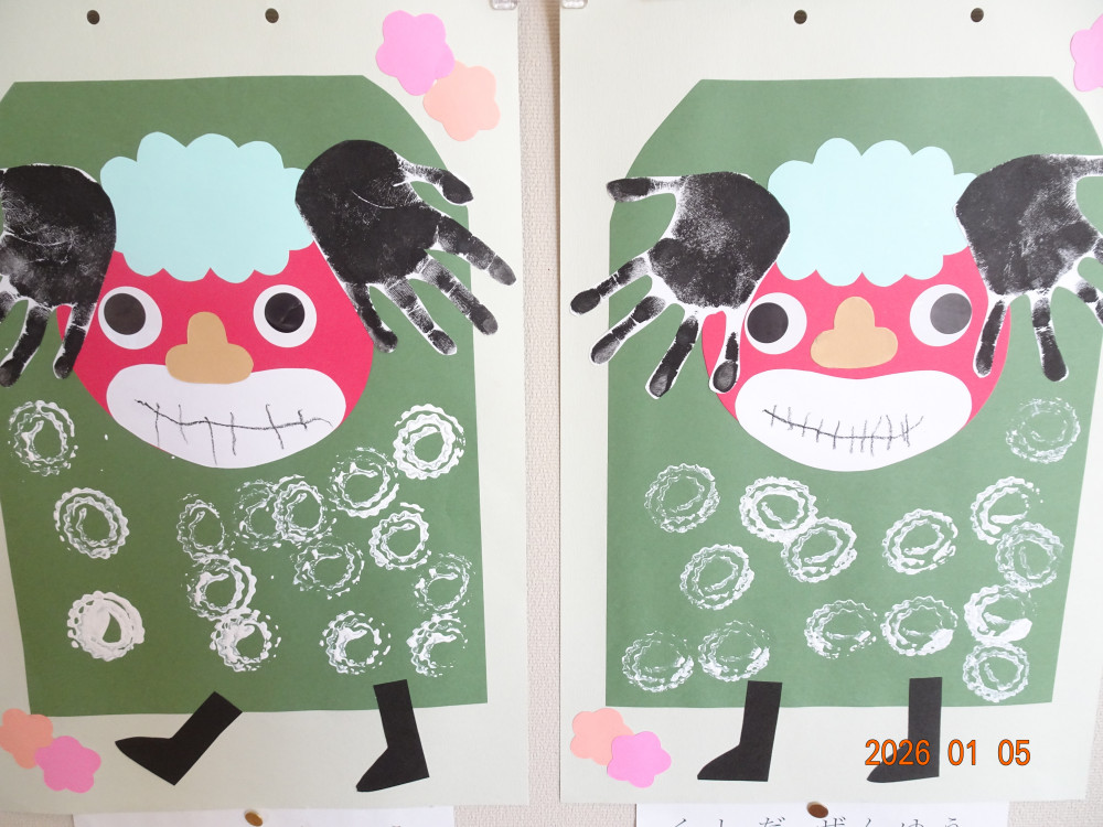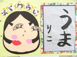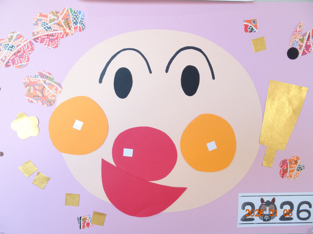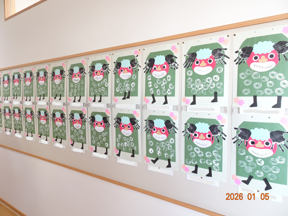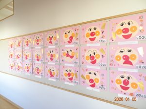 今月、令和8年1月の壁面製作(さくら保育園の内廊下の掲示板展示)は、福笑いや獅子舞や書き初めなど、お正月にちなんだ作品です。 1歳児クラスうめ組の作品 2歳児クラスすみれ組の作品 3歳児クラスきく組の作品 4歳児クラスゆり組の作品 5歳児クラスひまわり組の作品