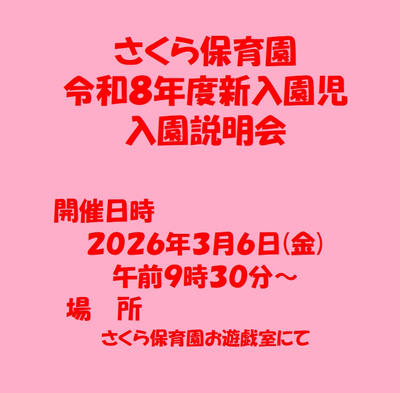 令和8年度、さくら保育園に入園が内定された方には、既にいわき市より「入所決定通知書」がご自宅に届いていると思いますが、令和8年3月6日(金)「さくら保育園令和8年度新入園児入園説明会」を実施いたします。