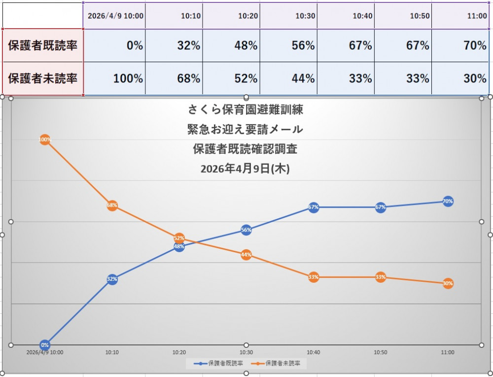 令和8年4月9日(木)、保護者向けの避難訓練「緊急お迎え要請メール」の既読率を調査しましたので、ご報告いたします。
